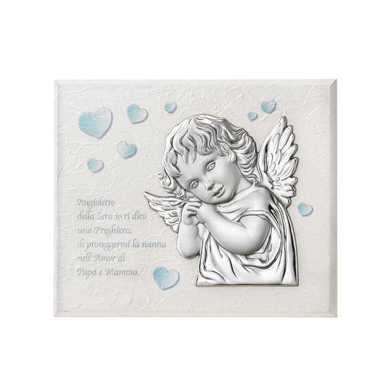 Quadro Angioletto della Sera con cuoricini color azzurro Quadro rifinito a mano dalle maestre della nostra Bottega D’Arte con Lastra d’Argento 925/1000