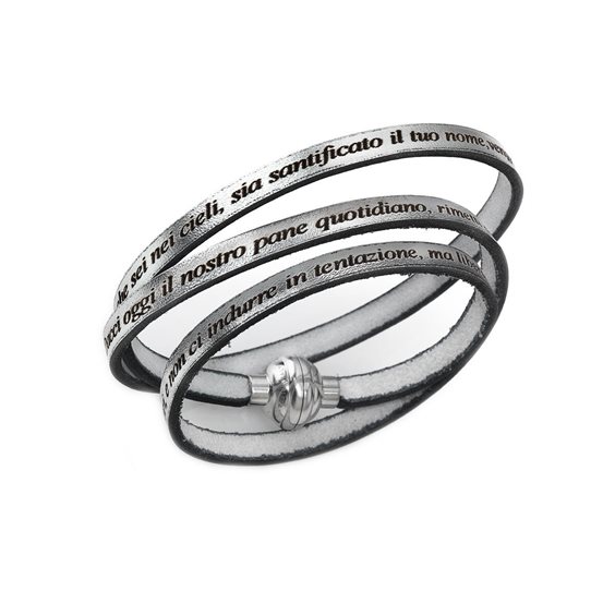 Bracciale Padre Nostro in pelle naturale color argento con chiusura magnetica. Incisione preghiera "Padre Nostro" in Italiano.