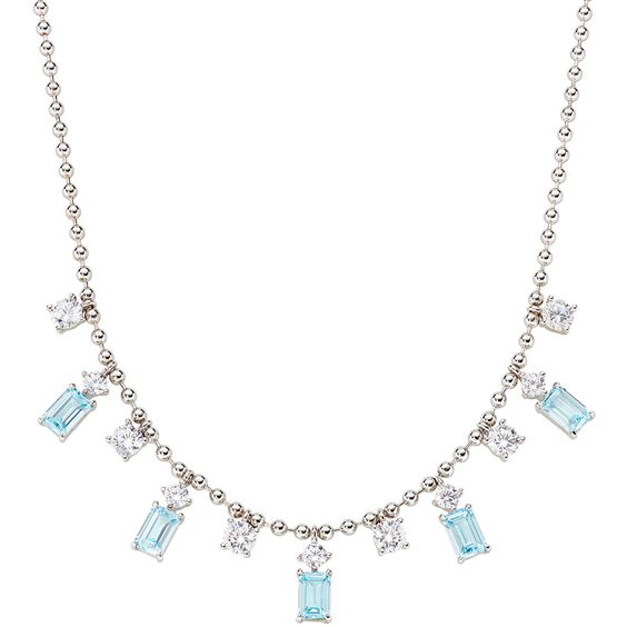 Collana da donna di Amen. Gioiello in argento 925 con placcatura in rodio e zirconi bianchi e acquamarina. La lunghezza è: 40 + 5 cm.
