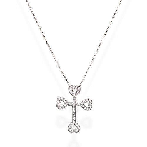 Collana Croce Ancorata Cuori - Collana in Argento 925 e zirconi bianchi Rodio - Lungh. 42cm - croce 1,5x2,5cm