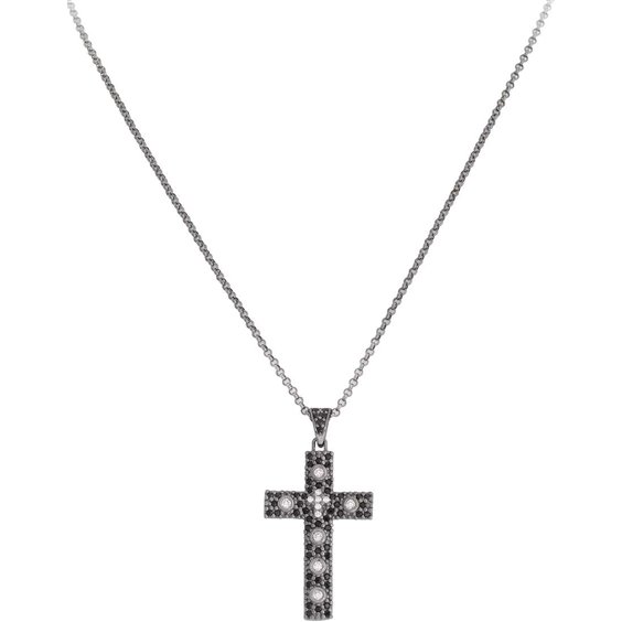 Collana Amen collezione Rosari in argento 925 con pendente fatto a croce con zirconi neri e bianchi. Lunghezza 40cm + 5 cm di chiusura