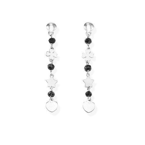 Orecchini Pendenti e Cristalli Neri - Orecchino in Argento 925 e cristalli neri Rodio - Cuore, Quadrifoglio e Stella - Lungh. 4,5cm
