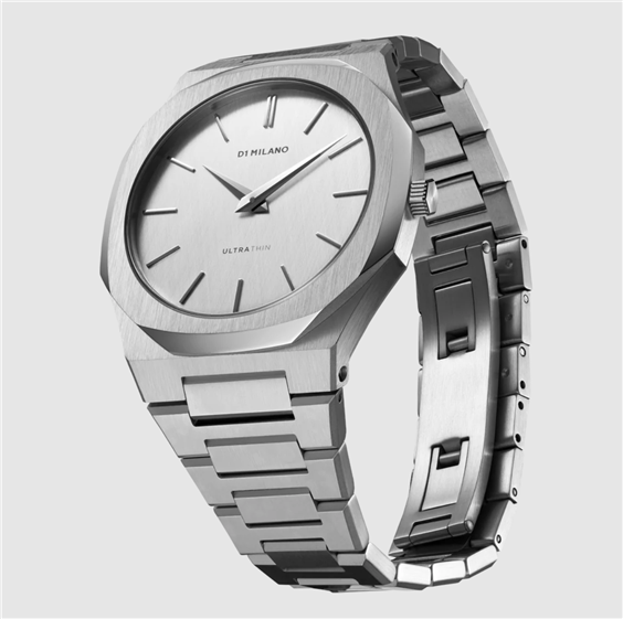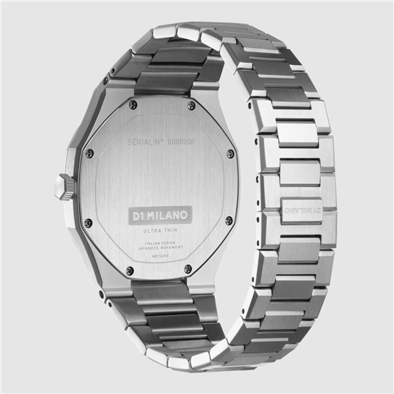 Orologio D1 Milano in acciaio spazzolato. Orologio D1 Milano con cinturino in acciaio e quadrante acciaio. Misura cassa 40mm X 6,20mm. Materiale cassa acciaio inossidabile 316L, spazzolato e lucidato. Chiusura con farfalla nascosta. Vetro zaffiro antiriflesso. Movimento Citizen Miyota 1L22, al quarzo. 5 ATM. Garanzia 2 anni.
