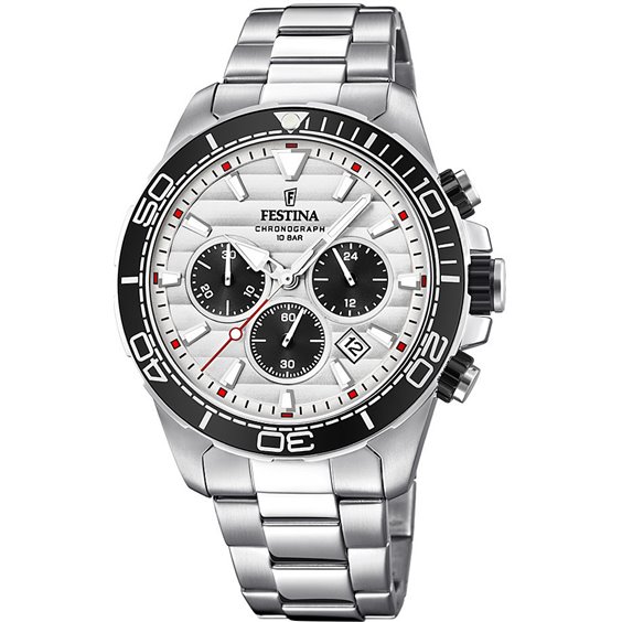 Orologio Festina da uomo cronografo con display analogico e alimentazione al quarzo. Cassa in acciaio di forma rotonda con diametro di 44.30mm, quadrante colore bianco con dettagli neri e rossi, cinturino in acciaio. Resistenza all'acqua di 10 atm.