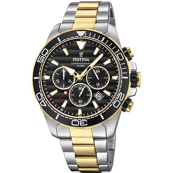 Orologio Festina da uomo cronografo con display analogico. Cassa in acciaio di forma rotonda con diametro di 44.31mm, cinturino in acciaio bicolore e quadrante nero con dettagli gialli. Resistenza all'acqua di 10 atm.
