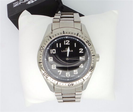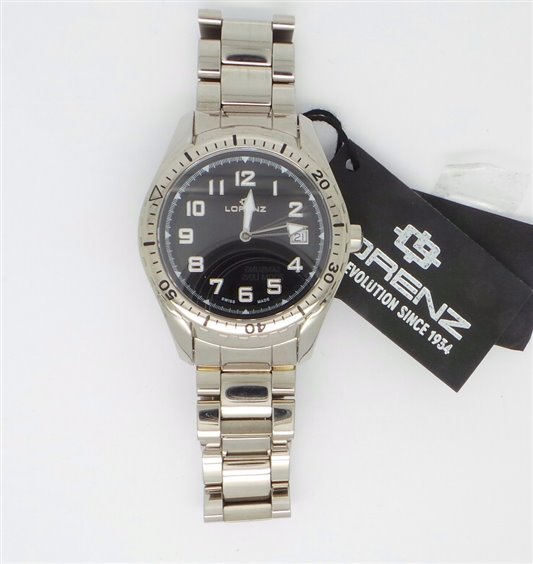 Orologio Lorenz collezionePatron . Movimento svizzero. Cassa 40mm. Bracciale e cassa interamente in titanio. Quadrante nero. Datario. Vetro zaffiro. Sfere e numeri luminescenti. Fondello e corona a vite. Water resistant 10 Atm. chiusura a deploayante