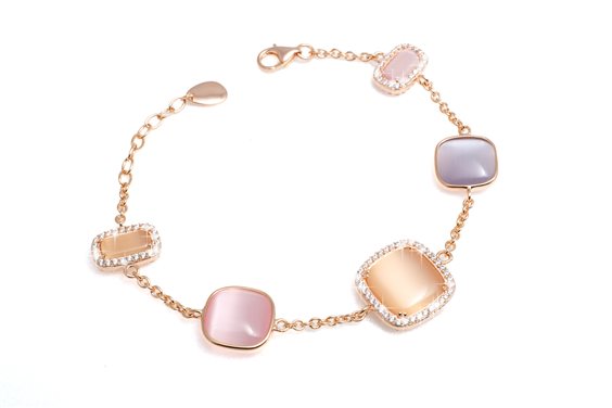 Bracciale in Argento 925 placcato Oro rosé. Le pietre montate sono quarzi ecologici nei colori lilla, rosa e champagne, illuminate da zirconi da entrambe i lati.