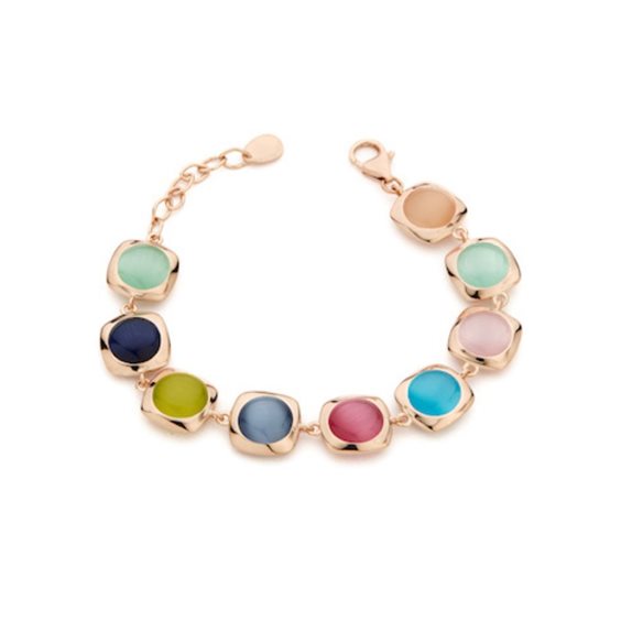 Bracciale in argento rosè con quarzo idrotermale di vari colori. Chiusura con moschettone e catenella per l'allungo. Oblò mm 13x13.