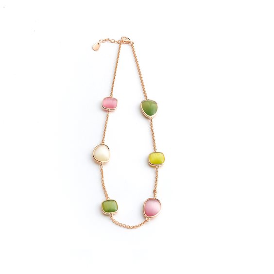 Collana in argento rosè 925 con quarzi idrotermali colorati. Chiusura a moschettone con allungo.