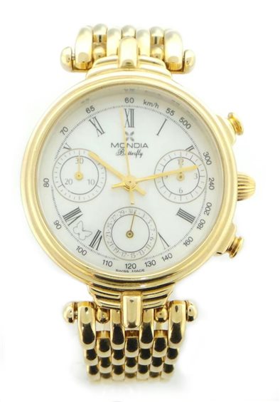Orologio cronografo da donna in acciaio placcato oro , movimento svizzero al quarzo , vetro minerale , cassa mm 32 , quadrante madreperla , datario , cinturino con chiusura gioielleria.