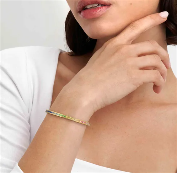 Bracciale in Acciaio con Mix di Zirconi Colorati Materiale Acciaio 316/304 anallergico Altezza 0.4 cm Misura Pietre 2x2 mm Misura 6,3x5,5 cm. I dettagli decorativi con Cubic Zirconia sono solo sul fronte del Bracciale