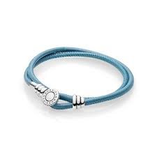 bracciale doppio avvolgente versatile e chic in vera pelle.Tonalità turchese fibbia in argento con inciso il logo PANDORA e decorata con pietre chiare. Apri il braccialetto spingendo il disco attraverso il passante in pelle e aggiungi la modifica da 7 a 9 charms.