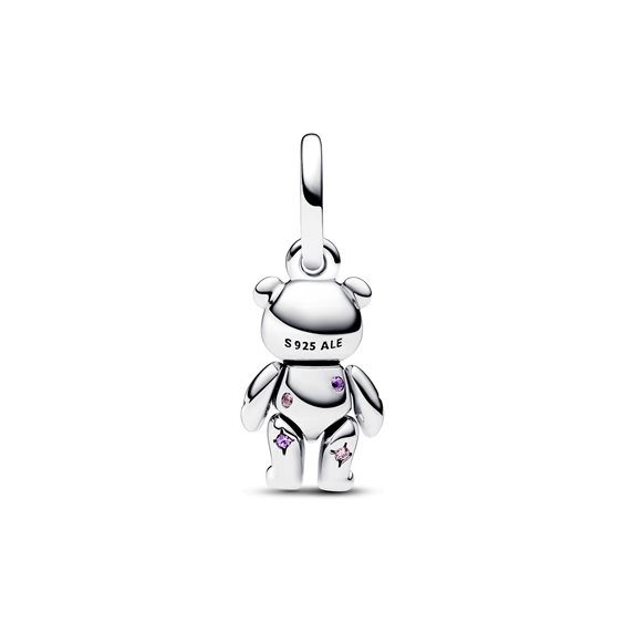 Pendente Orsetto Teddy Argento Sterling 925; 3 cristalli blu creati in laboratorio con incastonatura a filo in stelle ritagliate, taglio brilliante rotondo; 4 cristalli viola creati in laboratorio con incastonatura a filo, taglio brillante rotondo; 4 zirconia cubica rosa con in