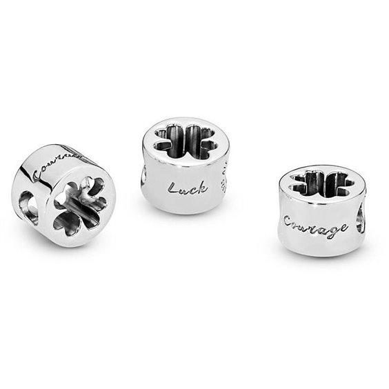 Aggiungi al tuo bracciale Pandora Moments charm portafortuna e simboli personali, come questo charm con quadrifoglio in Argento Sterling 925. Il design aperto lascia intravvedere il bracciale Pandora Moments su cui viene inserito. Decorato dalle parole “luck” e “courage”, è un’aggiunta ricca di significato alla tua collezione, per ricordare qualcosa che ami.