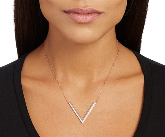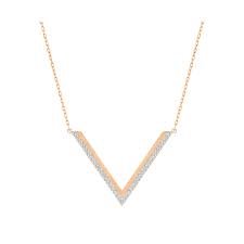 Piglio contemporaneo per un motivo classico. La collana Swarovski placcata oro rosa propone un motivo grafico a “V” interpretato in pavé di Clear Crystal. Il gioiello è anche disponibile in una versione più piccola.