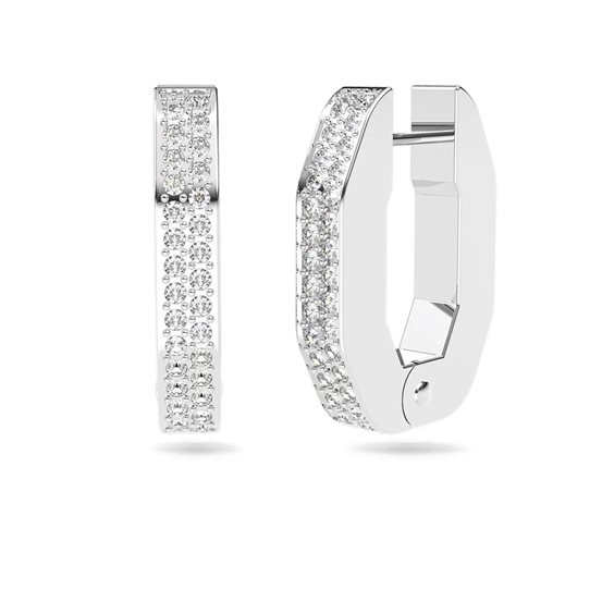 Uno statement di modernità è espresso da questi piccoli orecchini a cerchio di forma ottagonale, dai dettagli complessi eppure strutturati con audacia, che incarnano la sofisticata tecnica pavé di Swarovski. Delicati cristalli bianchi inseriti in montature placcate in rodio sottolineano il design di ispirazione industriale, da indossare singolarmente o sovrapposti sull’orecchio, insieme ad altri elementi della linea Dextera. Parte della linea Dextera, questi orecchini sono firmati dalla Direttrice creativa Giovanna Engelbert per la Collection II. Immagini a scopo illustrativo.