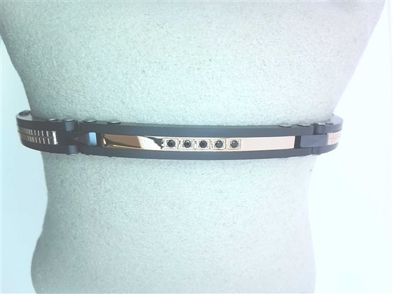 BRACCIALE A ELEMENTI CON TARGA CENTRALE IMPREZIOSITA DA 5 ZIRCONIE NERE. IL GIOIELLO E' IN ACCIAIO BRUNITO E PVD ORO ROSA E GLI SNODI SONO IN VETROCERAMICA NERA